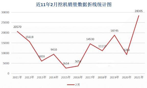 2021年2月挖掘機銷量數(shù)據(jù)創(chuàng)2月歷史新高,之前最高年份為2011年2月的20570臺,2021年2月的28305臺,超出2011年2月約38%。2021年1-2月累計4.79萬臺,比2011年1-2月累計3.17萬臺,超過約51%。