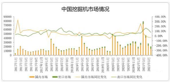 按照CME預測計算,2021年1-6月挖掘機銷量221233臺,同比增速29.8%,其中國內市場192235臺,同比增速23.3%;出口市場28998臺,同比增速99.5%。
