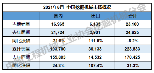 2021年6月,共計銷售各類挖掘機械產品23,100臺,同比下降6.2%。其中,國內市場銷量16,965臺,同比下降21.9%;出口銷量6,135臺,同比漲幅111.5%。