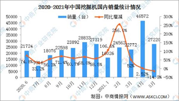 數(shù)據(jù)顯示,2021年5月銷售各類挖掘機(jī)27220臺(tái),同比下降14.3%;其中國(guó)內(nèi)22070臺(tái),同比下降25.2%;出口5150臺(tái),同比增長(zhǎng)132%。2021年1-5月,共銷售挖掘機(jī)200733臺(tái),同比增長(zhǎng)37.7%;其中國(guó)內(nèi)176735臺(tái),同比增長(zhǎng)31.7%;出口23998臺(tái),同比增長(zhǎng)106%。