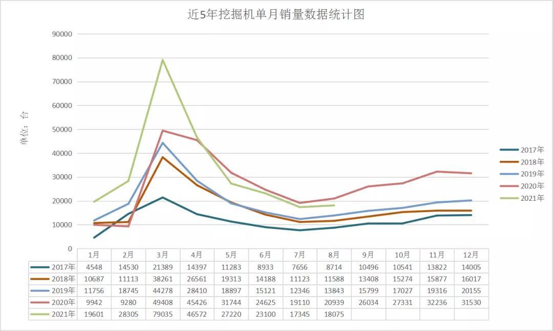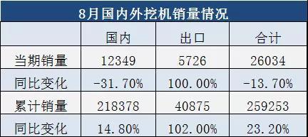 據中國工程機械工業協會對25家挖掘機制造企業統計,2021年8月銷售各類挖掘機18075臺,同比下降13.7%;其中國內12349臺,同比下降31.7%;出口5726臺,同比增長100%。