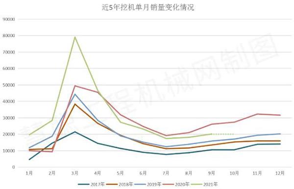 經草根調查和市場研究,預計2021年10月挖掘機(含出口)銷量20000臺左右,同比增速-27%左右。其中,